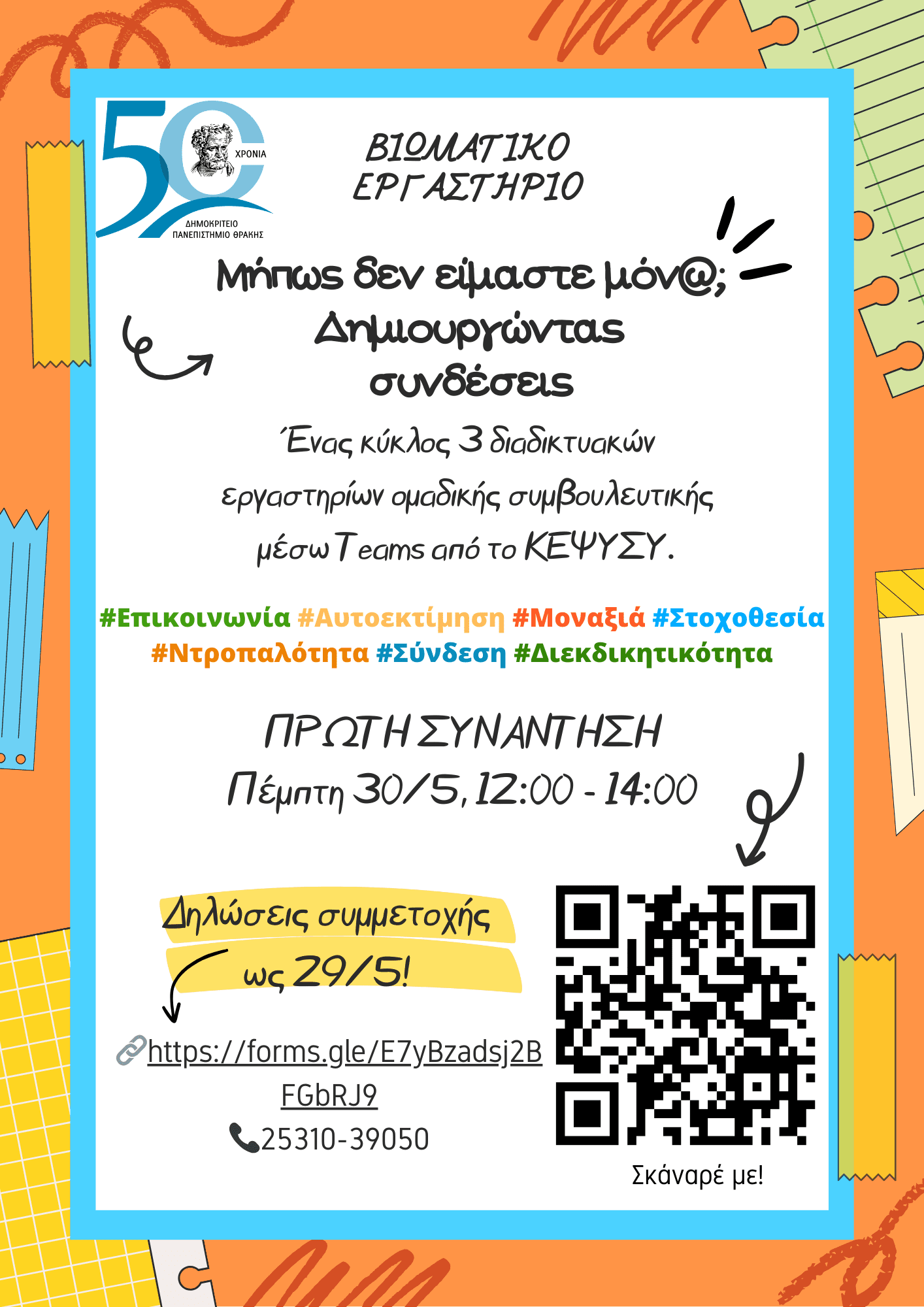 Το εργαστήριο ομαδικής συμβουλευτικής θα αποτελείται από έναν κύκλο τριών διαδικτυακών συναντήσεων που θα διεξαχθούν μέσω της πλατφόρμας Microsoft Teams και η πρώτη συνάντηση θα πραγματοποιηθεί στις 30/5/23 και ώρες 12:00 με 14:00.