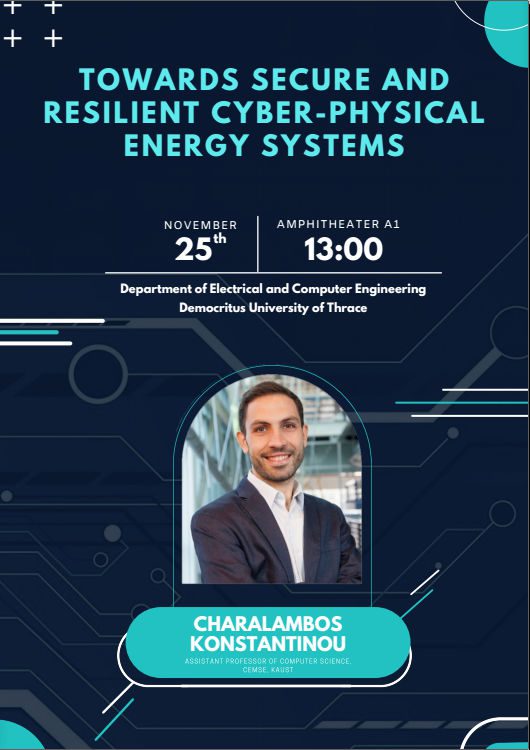 Η διάλεξη θα παρουσιάσει τις ερευνητικές δραστηριότητες του εργαστηρίου Secure Next Generation Resilient Systems (SENTRY) (sentry.kaust.edu.sa) στο KAUST. Οι αλλαγές που πραγματοποιούνται στις κρίσιμες υποδομές του δικτύου ηλεκτρικής ενέργειας ενσωματώνοντας καινοτόμες υπολογιστικές τεχνολογίες, συμβάλλουν στον εκσυγχρονισμό του κεντρικού δικτύου επιτρέποντας το βέλτιστο σχεδιασμό, τον ευέλικτο έλεγχο των πόρων του δικτύου, καθώς επίσης και τη συνολικά καλύτερη παροχή υπηρεσιών. Η ψηφιακή ασφάλεια τέτοιων συστημάτων, ωστόσο, παρουσιάζει σημαντικές προκλήσεις όσον αφορά τον αδιάληπτο έλεγχο και τη διαρκή πρόσβαση σε πόρους και υπηρεσίες. Η κυβερνοασφάλεια των συστημάτων, ο έλεγχος τρωτότητας, η άμεση αντιμετώπιση κινδύνων, και ο σχεδιασμός ανθεκτικών σύγχρονων «κυβερνο-φυσικών» συστημάτων μεγάλης κλίμακας θα πρέπει να λαμβάνουν υπόψη την αλληλεξάρτηση μεταξύ όλων των επιπέδων τους. Η ομιλία θα παρουσιάσει προσομοιώσεις διάφορων στρατηγικών επίθεσης αναδεικνύοντας τις επιπτώσεις κυβερνοεπιθέσεων στα συστήματα ηλεκτρικής ενέργειας. Στόχος είναι η εκτίμηση του αντίκτυπου τέτοιων επιθέσεων αλλά και η εφικτότητα σχεδιασμού αυτοματοποιημένων μεθόδων ανίχνευσης τους, προκειμένου να ενισχυθεί η ανθεκτικότητα των συστημάτων ενέργειας.